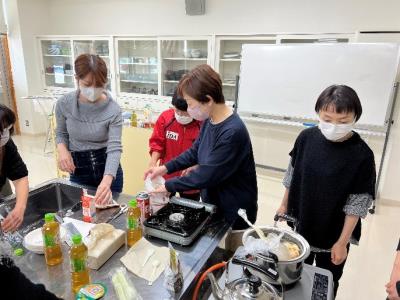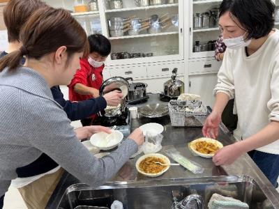 講義のあとはパッククッキングを行いました。パッククッキングのメリット、使用するポリ袋の選択から調理方法や工夫を教えていただき、短時間で主食からデザートまで4品を調理して試食した他、非常食の試食もしました。ポリ袋に材料を入れることで、同じ鍋で何種類もの調理が同時に行えることが目からうろこでした。また、食べてみるとそのおいしさにびっくりです。