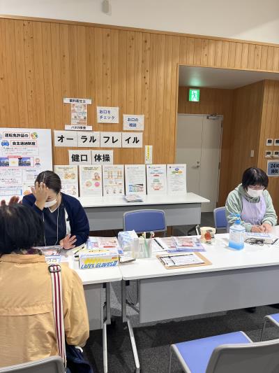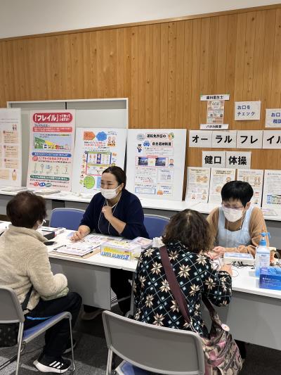 担当させていただいた歯科衛生士のコーナーでは、お口の健康に関する普段の困りごとがないかを尋ねる個別相談から、健口くんを用いた“オーラルディアドコキネシス”や“反復唾液嚥下テスト(RSST)”の口腔機能測定、健口体操の方法説明、オーラルフレイルのパネル展示、リーフレット配布(長野県歯科衛生士会作成のオーラルフレイル対策・高齢者のための口腔ケア・こんなにすごいだ液の働き)を行いました。どなたもお口の健康に対する関心が高く、熱心にお話を聞いてくださる姿がとても印象的でした。